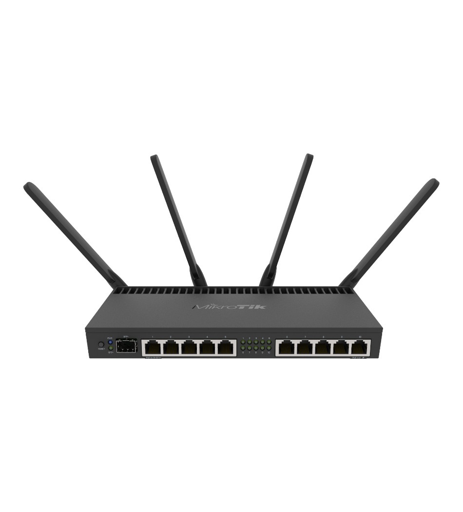 A conectividade cabeada é um dos principais destaques. O roteador oferece dez portas Gigabit Ethernet 10/100/1000 independentes, cada uma controlada diretamente pela CPU por meio de um switch chip RTL8367SB, permitindo encaminhamento de quadros em nível de linha sem bloqueios. Para uplinks de alta velocidade, está presente uma interface de fibra SFP+, que suporta transceptores e cabos de cobre ou fibra com taxa de 10 Gbps, sendo compatível com módulos MikroTik e de terceiros qualificados.